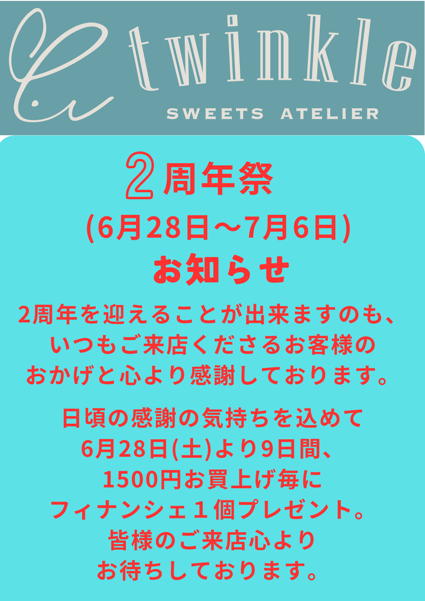 2周祭 2024/06/25 2周年を迎えることが出来ますのも、いつもご来店くださる お客様のおかげと心より感謝しております。 日頃の感謝の気持ちを込めて、6月28日(土)より9日間、 1500円お買上げ毎にお好きなフィナンシェ1個プレゼント。 皆様のご来店心よりお待ちしております。