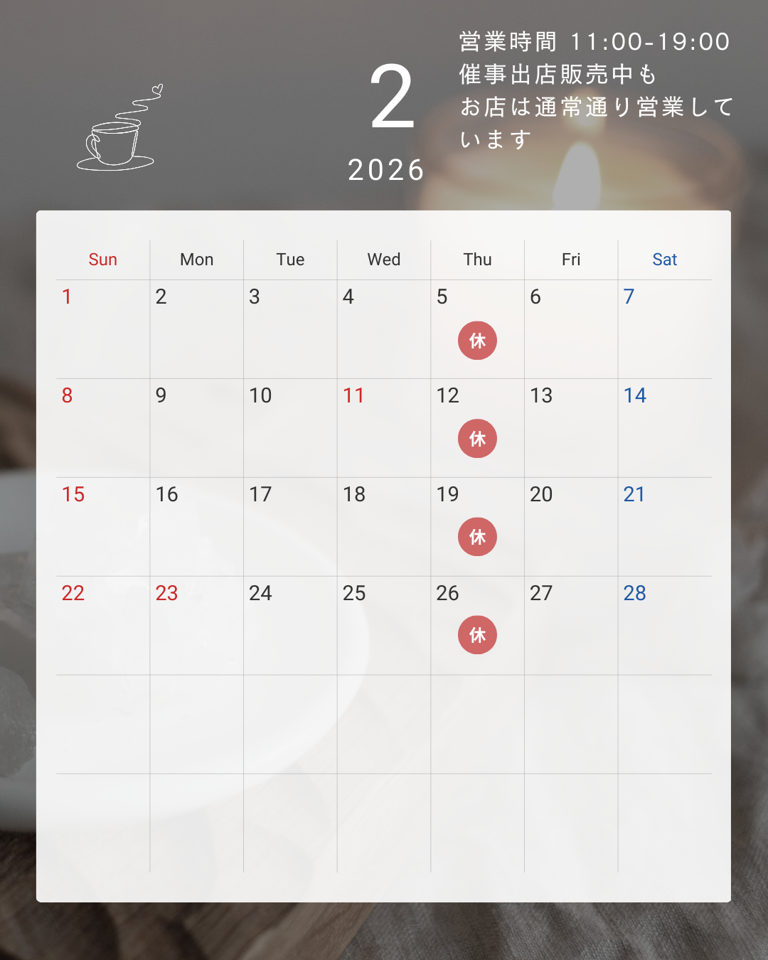2月の営業予定 2026/02/01 皆様、いつも当店をご利用いただきありがとうございます。 先日、新発売いたしました”濃厚抹茶プリン”が「とても美味しかった」と多数お声をいただいています。 皆様もぜひ一度ご賞味ください。 今月もよろしくお願いいたします。