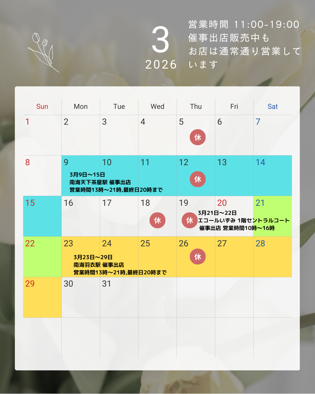 3月の営業予定 2026/02/28 皆様、いつも当店をご利用いただきありがとうございます。 今月もたくさんのご来店ありがとうございます。 3月は南海の天下茶屋駅、羽衣駅、エコールいずみでの催事出店がございます。 お近くにお越しの際はぜひ、お立ち寄り下さい。 よろしくお願いいたします。